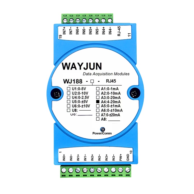 WJ188 擁有 8 路模擬信號采集通道,能夠同時接入多種類型的傳感器信號。無論是 4-20mA 的電流信號,還是 0-10V 的電壓信號,它都能輕松應(yīng)對。其采用的 12 位 AD 轉(zhuǎn)換器,測量精度優(yōu)于 0.1%,可以精確地采集模擬量數(shù)據(jù),為工業(yè)生產(chǎn)提供可靠的數(shù)據(jù)支持。而且,用戶還能通過網(wǎng)絡(luò)程控校準模塊精度,即使在復(fù)雜的工業(yè)環(huán)境中,也能確保數(shù)據(jù)的準確性。