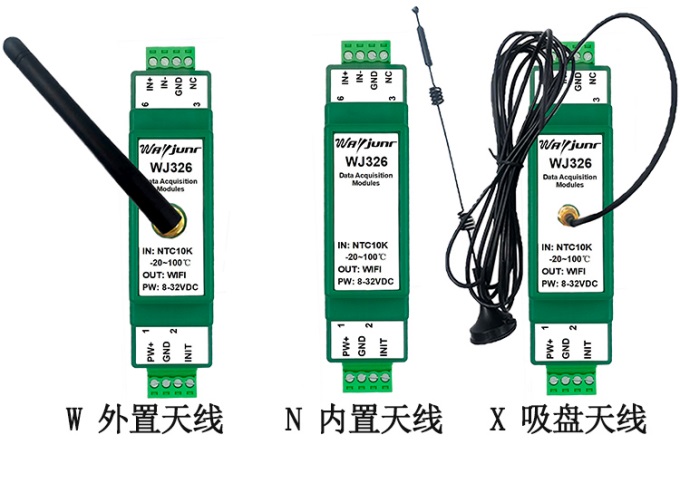 選型舉例2: 型號(hào):WJ326-NTC100K-T2-WiFi-W   表示1NTC100K, 0~100℃信號(hào)輸入,輸出為WiFi網(wǎng)絡(luò)接口天線為外置天線